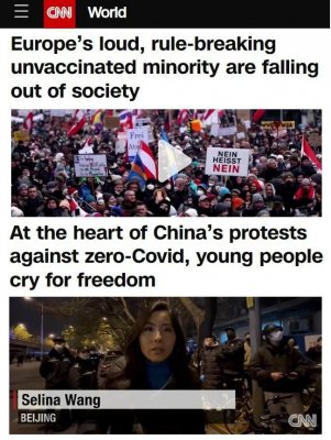 Как CNN освещает антиковидные волнения в Германии и в КНР. «Крикливое, противоправное меньшинство европейских антипрививочников выпадает из социума». «В основе китайских протестов против ковид-ограничений крик молодежи о свободе!» Двойные стандарты, манипулирование мнением, ложь - основы "неполживых" западных сми.1 балл