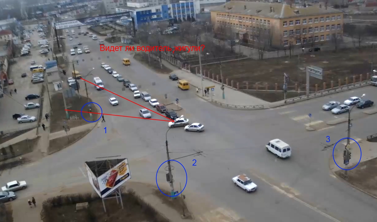 На водителя смотрит прямо светофор под номер 2 и его для него никто не загораживает!!!