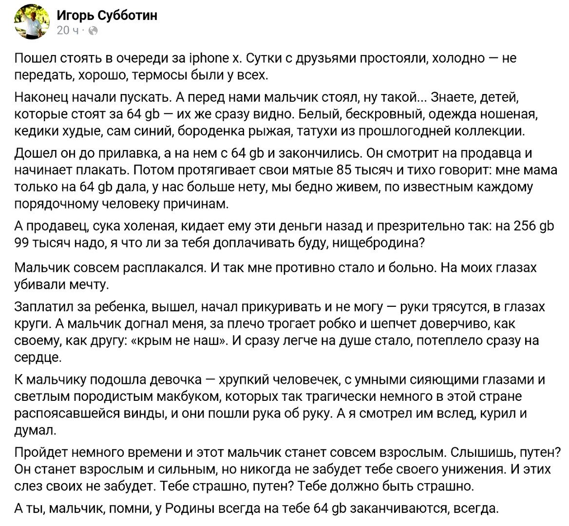 простите меня сразу я новый.история моя будет долгой и не интересной скорей всего.я такой весь в политике,имел дело с ватником,когда я ему сказал чта будет сабчак балатироваться он мне сказал что я в политике имбицил,сейчас молчит ведь я прав был.суть даже не в этом.суть в том что он строит участок в началово.говорит воду провести не дают мол начальству денег дали на насос а деньги на авто директору ушли и он разрешения не дает. и общаются между собой эти 2 ватана один другому говорит мол в 2018-ом все прекратится,я запомнил это и когда 1 из ватанов сел ко мне в авто я спросил почему все прекратится в 2018-ом, он ответил мне мол путена уберут, смеялся долго.эх.а он ведь телик не смотрит.и все равно ватан.как так?па скриптту спициально речь путаю и не пишу правильно чтаб вы хзнали кто я.иксдэ
