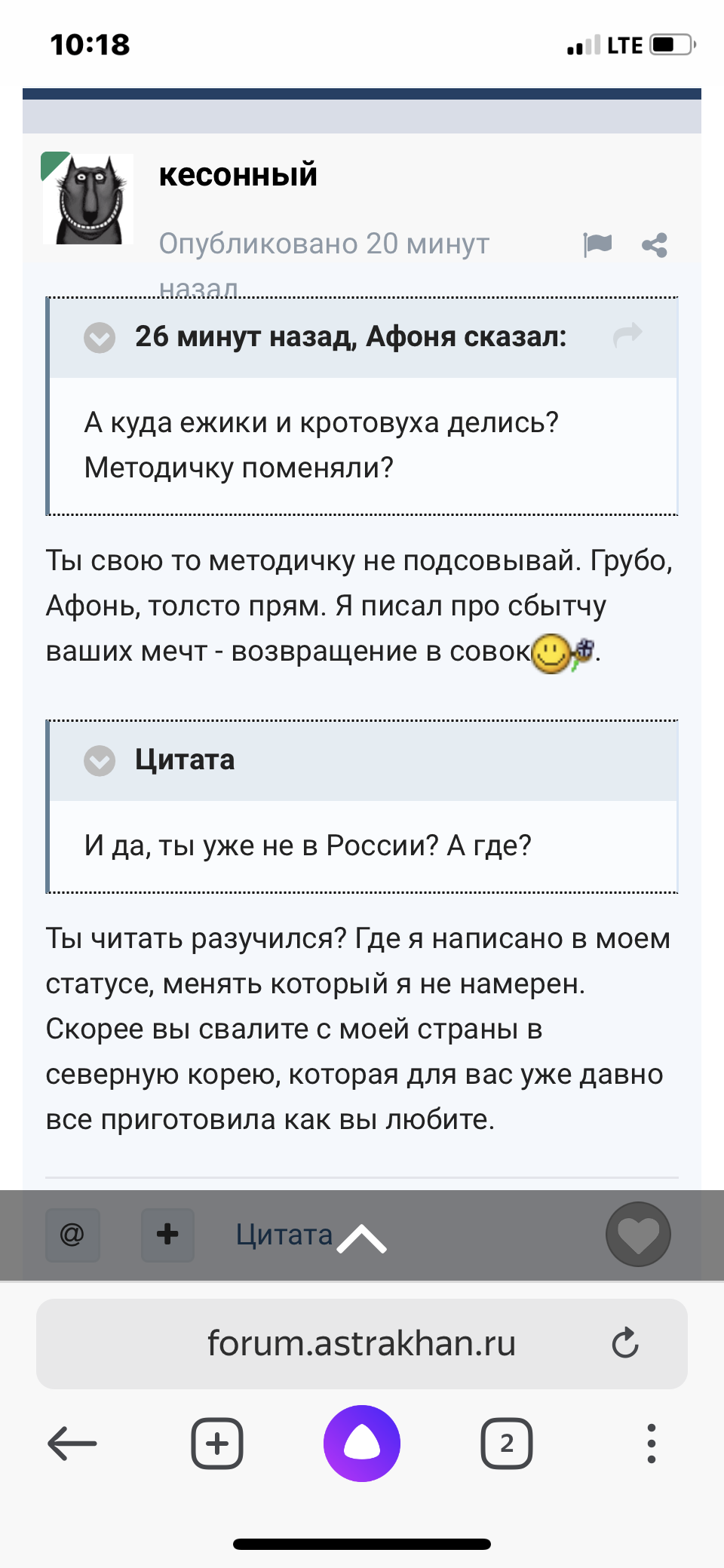 кесонный Опубликовано 10 марта, 2023 Жалоба Share Опубликовано 10 марта, 2023 4 часа назад, Афоня сказал: Конечно не твои, но и не мои, поэтому позволь мне думать , что ты сейчас пишешь из какого -нибудь казахского аула недалеко от границы с Россией. Тем более когда ты пишешь: вы в России , у вас в России, вам в России и тд это навевает на мысли , что тебя здесь нет. Оттого, что я не позволю тебе писать про меня всякую херь ничего же для тебя не поменяется? Ну тогда, если ты даешь себе волю на безграничные фантазии, то и я могу так же позволить себе представить тебя пишущим сие и одновременно надраивающим языком сапоги своему куратору. Неудобно скажешь? Но это то же не мои проблемы. Цитата Ссылка на комментарий Поделиться на другие сайты More sharing options...